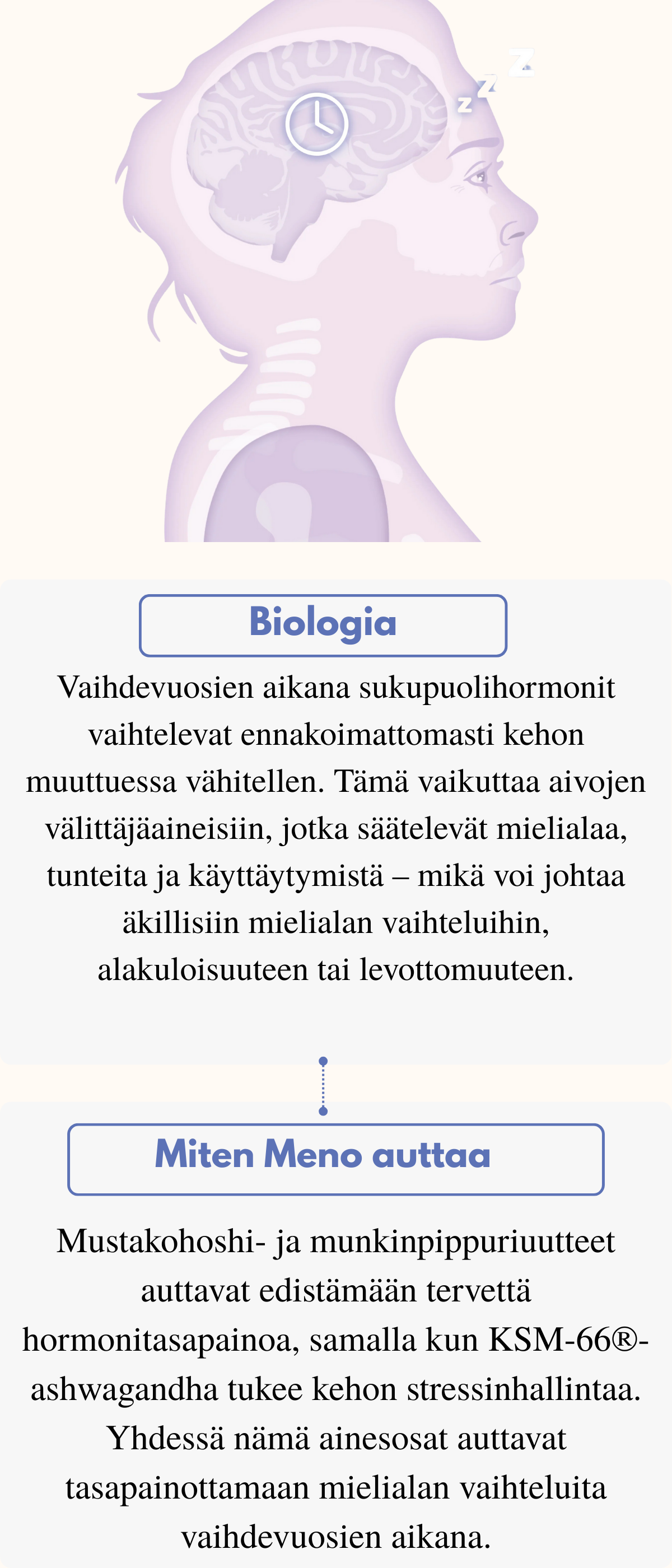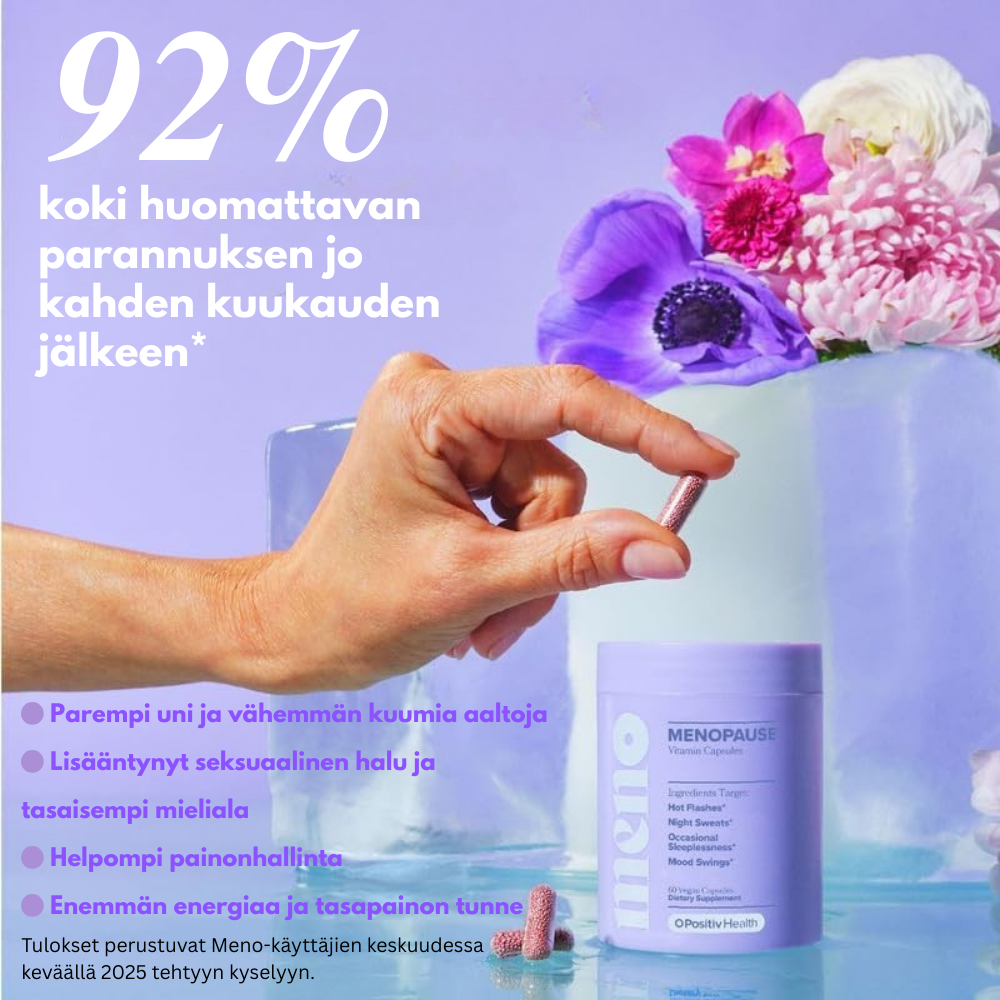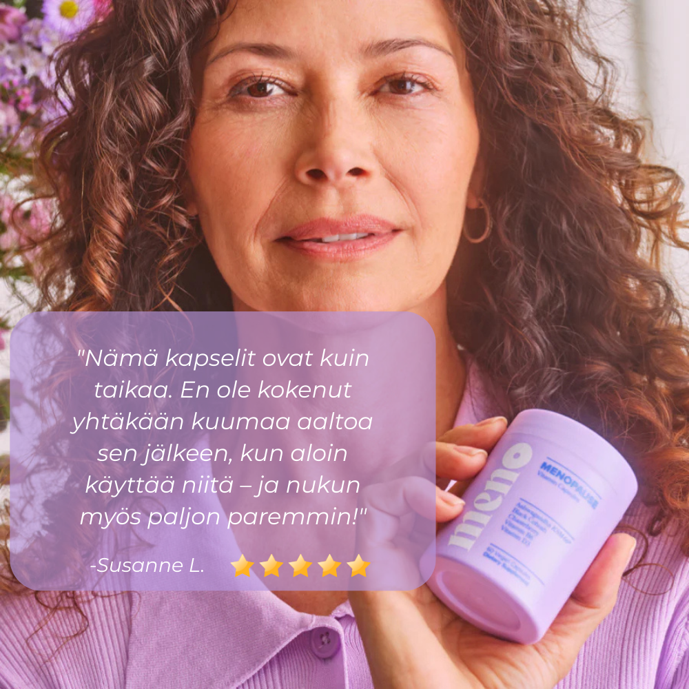 MENO on moderni, hormoniton ravintolisä, joka on kehitetty lievittämään useita vaihdevuosien yleisimpiä oireita – kuten kuumia aaltoja, unihäiriöitä, levottomuutta, mielialan vaihteluita ja energiavajetta. Tuote on suunnattu naisille, jotka haluavat luonnollisen vaihtoehdon hormonihoidolle.
