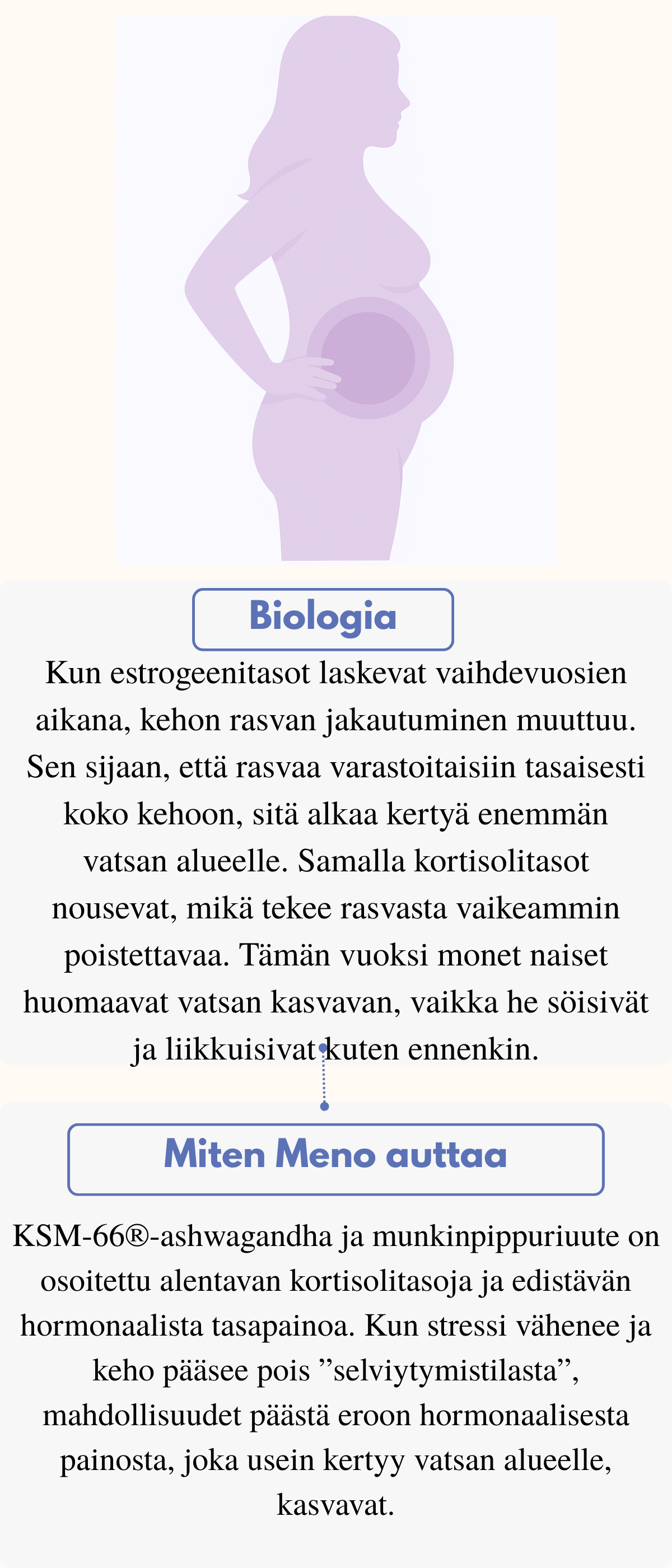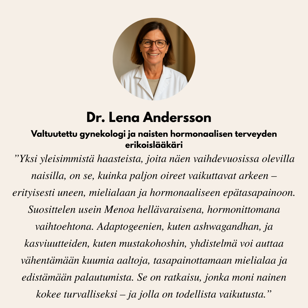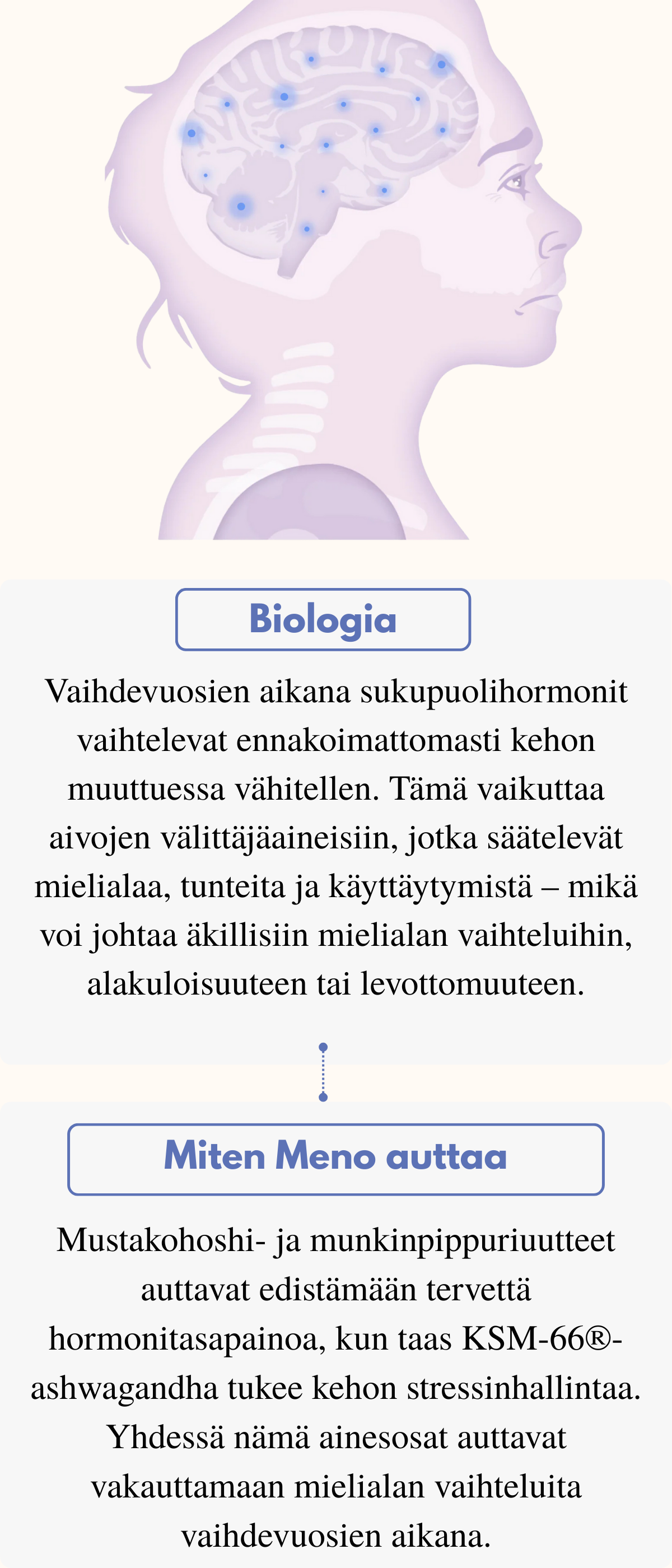 MENO on moderni, hormoniton ravintolisä, joka on kehitetty lievittämään useita vaihdevuosien yleisimpiä oireita – kuten kuumia aaltoja, unihäiriöitä, levottomuutta, mielialan vaihteluita ja energiavajetta. Tuote on suunnattu naisille, jotka haluavat luonnollisen vaihtoehdon hormonihoidolle.